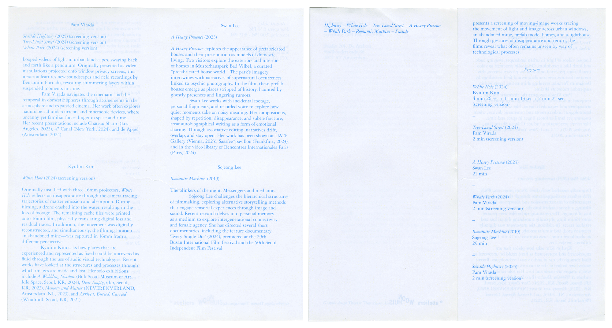 Highway, White Hole, Tree-Lined Street, A Heavy Presence, Whale Park, Romantic Machine, Seaside; screening program, ephemera, 2025